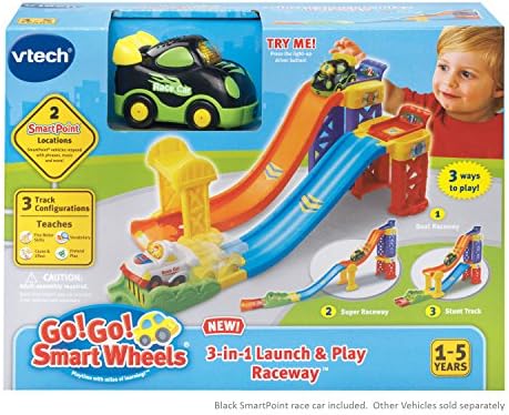 Product Description The go! go! smart wheels 3-in-1 launch & play Raceway from VTech features three exciting race configurations and an electronic race car that responds with sounds and phrases when placed on SmartPoint locations. Key Features: 2 SmartPoint locations interact with SmartPoint vehicles to play fun phrases, music and sound effects,Three track configurations: dual Raceway, Super Raceway and stunt track,The lift-up launcher strengthens fine motor skills,Includes one SmartPoint race car that teaches the letter aRa and the name of the vehicle through pretend play,In an effort to continually improve our products, the item inside this package may vary slightly from the photographs.,Enhance your child's creativity through playtime with Go! Go! Smart educational toys; kids build a 3 different car race tracks with one toy,Interactive role-play features include a lift-up launcher that develops fine motor skills; launch cars down the track for endless fun,Car track features VTech SmartPoint technology; comes with 2 SmartPoint locations that interact with SmartPoint vehicles to trigger fun phrases and music,Vehicle set includes one SmartPoint race car that teaches the letter "R" and the name of the vehicle through pretend play; included 2 AA batteries,VTech Go! Go! Smart Wheels, Animals and Friends track pieces can be connected for maximum play; a great early learning center for children ages 1 to 5 This product is designed with premium quality, ensuring durability and superior performance.