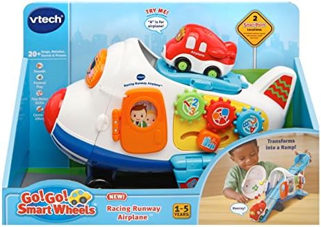 Product Description Take flight with the Go! Go! Smart Wheels Racing Runway Airplane by VTech. The airplane transforms from a cargo plane into a runway ramp that launches the included SmartPoint airplane. Pretend to fly the electronic plane and land on two SmartPoint locations to hear fun phrases, music and more. Press the toy airplaneaTMs light-up button to hear sing-along songs and learn the letter A. Open the cargo plane's front cabin and lift the top to reveal a fun ramp. Key Features: Transforms from a cargo plane that holds up to two vehicles into a runway ramp that launches the included SmartPoint airplane; additional vehicles sold separately,Place the SmartPoint airplane on two SmartPoint locations to hear different phrases, music and fun sound effects; teaches the letter a and the name of the airplane,Includes a variety of manipulative features that strengthen motor skills and teach the concept of cause and effect,Works with other Go! Go! Smart Wheels, Go! Go! Smart Animals playsets and select Go! Go! Smart Friends tracks (each sold separately),Requires 2 AA batteries (batteries included for demo purposes only, new batteries recommended for regular use); intended for ages 1 to 5 years This product is designed with premium quality, ensuring durability and superior performance.