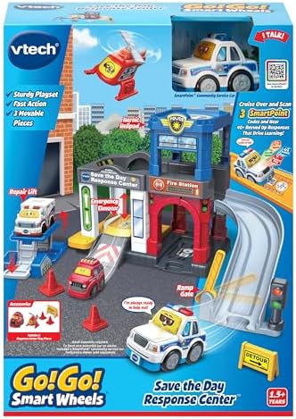 Product Description Race to save the day with this playset that blends the importance of helping others with multi-level imaginative play! Respond to heroic situations by stopping at the fire station or taking the emergency elevator up to the police precinct to answer calls from the captain. LetaTMs move! Zoom down the ramp, lift the gate, and go! go! to help those in need. Swerve around detours or add some eyes in the sky with the helicopter that can come in for a landing on the helipad. Key Features: This center includes a heroic helipad, fire station with emergency elevator and police precinct to provide help to the community,Three interactive SmartPoint locations fuel a desire to assist in heroic situations with encouraging phrases and realistic sound effects,Land the helicopter on the helipad, inspect service vehicles on the repair lift and set up roadblocks to save the pretend-play day,SmartPoint Community Service Car introduces first words, songs and rescue phrases; add other Go! Go! cars to build up an entire squad (each sold separately),Intended for ages 1.5+ years; requires 2 AA batteries; batteries included for demo purposes only; new batteries recommended for regular use This product is designed with premium quality, ensuring durability and superior performance.