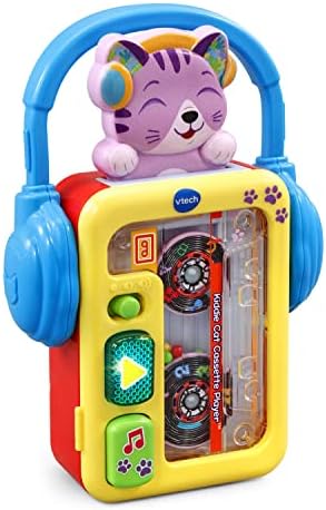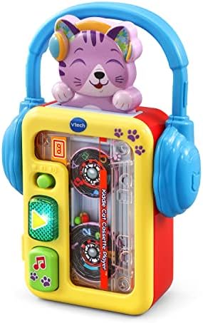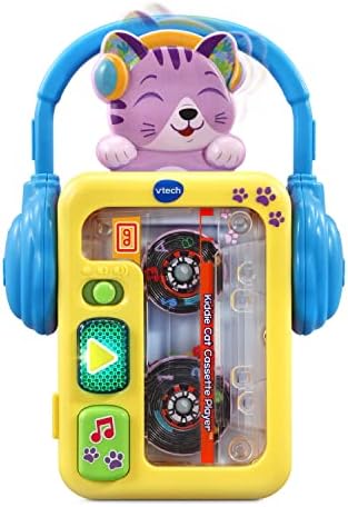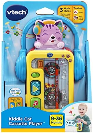 Product Description Turn back the clock and turn up the tunes with this retro musical toy, the Kiddie Cat Cassette Player. Bop to the music along with this head-bobbin' kitty to jazz, country and rock-n-roll style melodies and the Alphabet Song. This take-along music toy may remind you of a small, iconic portable tape deck, but this lil' player doesn't need cassettes to play music. The wheels do spin, which babies and toddlers will love to watch. As they press the buttons, kiddos can learn how their actions make the kitty bop up and down and side to side. Key Features: Tune into classic kids' melodies in 80s-style rock 'n' roll, country and jazz stylesaplus the Alphabet Song,Strengthen little fingers with two fidget buttons that turn the tape, rattle the beads and wiggle the kitty,Explore three music styles along with fun phrases, or push the Next button to play the next song, phrase or melody,Make the kitty move up and down and side to side; see how this cool cat bops along to the tunes!,Intended for ages 9-36 months; requires 2 AA batteries; batteries included for demo purposes only; new batteries recommended for regular use This product is designed with premium quality, ensuring durability and superior performance.