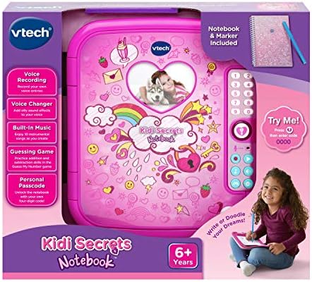 Product Description Encourage young writers with the Kidi Secrets Notebook! This electronic, passcode-protected journal comes with a notebook and marker and includes a hidden compartment for small treasures. When the secret four-digit code is entered correctly, the cover will spring open! With a cover that can be personalized with a photo, this journal gives children the space and privacy to develop their creativity. Kids can record voice entries and apply voice-changing special effects. Ten songs are included so children can listen to music as they draw and write. Key Features: Passcode-protected journal lets kids privately record their thoughts, notes and drawings Add a photo to personalize the cover,Includes a replaceable 4" X 6" notebook, marker and hidden compartment for small treasures,Record voice entries and add silly voice-changing effects Comes with 10 songs and a number-guessing game,Includes a parental passcode override function for peace of mind,Intended for ages 6-12 years Requires 3 A batteries Batteries included for demo purposes only This product is designed with premium quality, ensuring durability and superior performance.