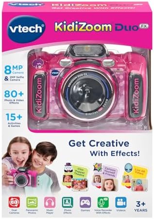 Product Description Unleash your creativity with this digital camera for kids, packed with 80+ photo and video effects, filters and frames including Live AR Avatar, Chin Puppet Theater and other artistic tools. Use the 2.4a screen or viewfinders to get the perfect shot using the front 8MP camera and 4X zoom or take a self-portrait using the 2MP selfie cam. More than a camera, this interactive tech toy includes five games where you can find lost ducklings, help aliens return to their planet and more. Key Features: Bring creativity into focus with 80+ photo and video effects, filters and frames including Live AR Avatar, Chin Puppet Theater, Cartoon Studio, panoramic and other artistic tools,More than a camera, play five games to find lost ducklings, help aliens return to their planet, match fruit and more,Record your voice with funny effects or add your own music to the MP3 music player using a microSD card (not included) to add to the enjoyment,Get the perfect shot with an 8MP front camera, 2MP selfie cam and 4X zoom using the 2.4a screen or viewfinders,Intended for ages 3+ years; requires 4 A batteries; batteries included for demo purposes only; new batteries recommended for regular use This product is designed with premium quality, ensuring durability and superior performance.
