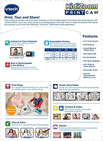 Product Description Click and print instantly with the KidiZoom PrintCama. Preview photos with the 2.4" color screen and print regular or panoramic photos in black and white. Flip up the lens to take selfies! The included paper roll prints up to 80 imagesathataTMs a pennies per print value! When the paperaTMs gone, get the KidiZoom PrintCama Paper Refill Pack (sold separately) to get three paper rolls and two adhesive paper rolls to turn photos into stickers. Also works with most 2.2"Wx1.2"D thermal paper refills. Let your creativity loose and add stickers, filters and borders to any image or video. Key Features: Take photos and selfies using the color screen and instantly print up to 80 black and white images using the included paperathataTMs a pennies-per-print value,Works with KidiZoom PrintCam Paper Refill Pack (sold separately) or most 2.2"Wx1.2"D thermal paper roll refills,Explore 110+ templates to create comic strips, play money, greetings cards and more; add effects, stickers, filters and borders to photos and videos; photos can be turned into drawings you can color,Play games between photo shoots; parents can set daily time and printing limits or turn off games,Intended for ages 4+ years; recharge non-removable lithium-ion battery with included USB cable; Product dimensions: 5.3" Wide x 3.6" Height x 1.9" Depth This product is designed with premium quality, ensuring durability and superior performance.