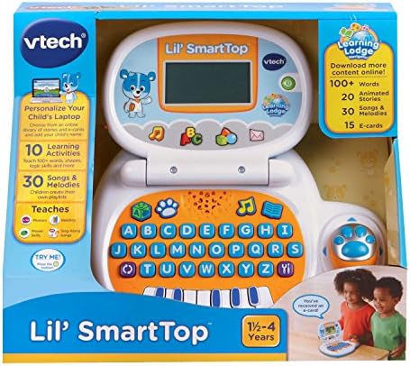 Product Description Product Description Creative play is right at your child's fingertips with the Lil' Smarttop by VTech. This toddler learning tool has 10 interactive learning activities for your child to explore. For even more learning fun, The Lil' Smarttop can be customized with your child's name, stories, favorite songs and even personalized e-cards! From the Manufacturer Toddler laptop featuring Cody the Smart Bear. Comes in a compact, portable style with carry handle. Features 10 learning activities, a working mouse, piano keyboard, A-Z letter buttons and 4 hotkey buttons for easy access to the games. Key Features: Early education toy is a kids laptop with working screen, keyboard, Mouse and piano keys; comes with 20 sing-along melodies or create your own,Toddler laptop has four modes of play that teach letters, phonics, music, shapes, and stories; Pre-K learning toy has handle for easy carrying and transport,Laptop for kids allows toddlers to learn with Cody the VTech Smart Cubs; play 10 different activities and receive pretend e-cards from family and friends,Kids computer can be customized with your child's name, stories, favorite songs and even personalized e-cards on VTech learning lodge,Electronic learning toy is intended for kids 18-48 months of age; comes USB cable and 2 A batteries are included for demo, use new batteries for regular use This product is designed with premium quality, ensuring durability and superior performance.