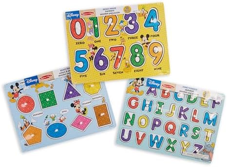 Product Description Product Description A, B, C . . . 1, 2, 3 . . . what color and shape do you see? These three wooden preschool puzzles (Disney Classics Alphabet, Mickey Mouse Clubhouse Numbers, and Mickey Mouse Clubhouse Shapes & Colors) feature sturdy plastic pegs to help children grasp each wooden piece, and classic early-learning subjects that make them a staple in any playroom. Key Features: 3 early-learning Disney-themed wooden peg puzzles,Disney Classics Alphabet features Disney characters under each letter and name guide on back,Mickey Mouse Clubhouse Numbers features images to count under numbers 0-9,8-piece Mickey Mouse Clubhouse Shapes & Colors features shape and color names under pieces,Ages 2+; 11.75a x 8.5a x .75a each This product is designed with premium quality, ensuring durability and superior performance.