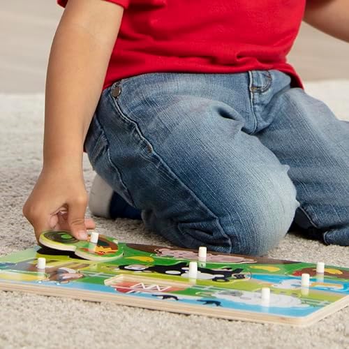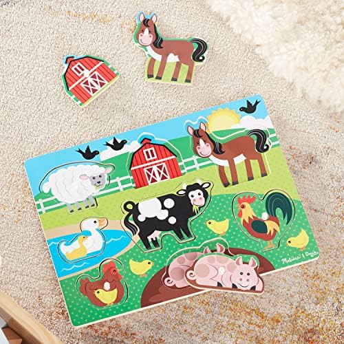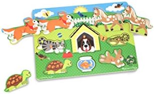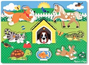 Product Description Product Description Children will love spending time with these beloved neighborhood pets as they place each wooden puzzle piece over the matching picture on the puzzle board. This sturdy 8-piece puzzle features easy-grasp pegs and wooden construction. Promotes hand-eye coordination, fine motor skills, problem-solving skills, and much more! This wooden puzzle is made from extra-thick, high-quality wooden materials, with easy-to-grasp pegs. Featuring 2 dogs, a cat, horse, turtle, rabbit, iguana, and goldfish, this puzzle promotes problem-solving skills and makes an exceptional gift for kids ages 2 to 4. Key Features: EASY-TO-GRASP PEG PUZZLE: The Melissa & Doug Pets Wooden Peg Puzzle is a pets-themed puzzle that features bright colors and 8 illustrations of kidsaTM favorite pets.,FULL-COLOR PICTURES: Our wooden puzzles for toddlers are designed with full-color matching pictures that appear underneath each piece Pets include 2 dogs, a cat, horse, turtle, rabbit, iguana, and goldfish.,PLAY AND LEARN: Designed to encourage hand-eye coordination, fine motor skills, and problem-solving skills, this wooden puzzle is made from extra-thick, high-quality wooden materials, with easy-to-grasp pegs.,GREAT GIFT FOR AGES 2 TO 4 YEARS: The Melissa & Doug Pets Peg Puzzle makes an exceptional gift for kids ages 2 to 4 Add the Melissa & Doug Safari Peg Puzzle to round out the hands-on, screen-free play experience.,aTHE GOLD STANDARD IN CHILDHOOD PLAYa: For more than 30 years, Melissa & Doug has created beautifully designed imagination- and creativity-sparking products that NBC News called athe gold standard in early childhood play.a,100% HAPPINESS GUARANTEE: We design every toy to the highest quality standards, and to nurture minds and hearts If your child is not inspired, give us a call and weaTMll make it right Our phone number is on every product! This product is designed with premium quality, ensuring durability and superior performance.