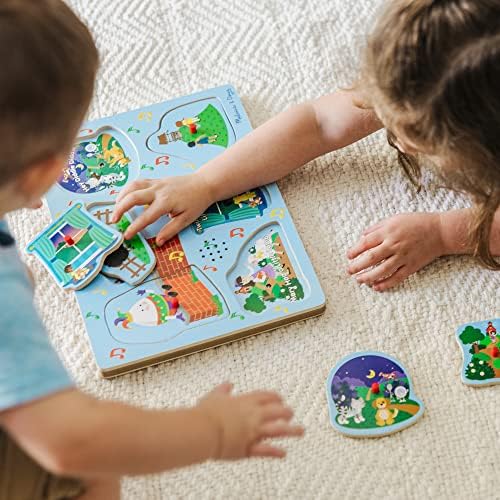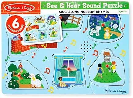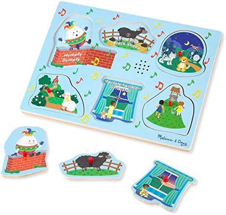 Product Description Product Description Sing along with favorite childhood characters like Humpty Dumpty and Jack and Jill with this unique wooden peg song puzzle! match the six illustrated wooden puzzle pieces to the pictures in the beautifully carved wooden puzzle board to hear six different nursery rhymes (Humpty Dumpty, Baa Baa black sheep, Hey Diddle Diddle, Mary had a little lamb, Twinkle Twinkle little Star, and Jack and Jill). plastic pegs make it easy for small hands to grasp and manipulate the pieces. Lyrics are included on the puzzle so kids can sing along as they complete the puzzle!. Key Features: Wooden peg puzzle that plays classic nursery songs when pieces are placed,Pictures on pieces match pictures on beautifully crafted puzzle board,Song lyrics included on puzzle,Helps teach hand-eye coordination and problem solving and helps develop auditory processing skills,Ages 2+; 11.75" x 8.75" This product is designed with premium quality, ensuring durability and superior performance.
