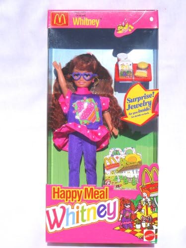 Product Description Barbie HAPPY MEAL McDonald's WHITNEY DOLL w HAPPY MEAL PACK, Tray, Burger & Surprise JEWELRY (1993) Key Features: Barbie HAPPY MEAL McDonald's WHITNEY DOLL is a 1993 Mattel production.,INCLUDES: WHITNEY DOLL approx 8" tall w Brown Hair in Braids Whitney Doll wears a Pair of Purple TIGHTS, a Purple w Pink & White Dots Trim DRESS (Long Top), a Pair of Heart Shape EYE GLASSES, Pair of Pink SHOES, & Comes with a McDonald's HAPPY MEAL BOX approx 2" w x 3" h, a Red TRAY with Molded MILK Carton & Glass, a Molded BURGER & Molded Fries (on Tray), & there's a Happy Meal SURPRISE JEWELRY Toy Inside the Box for YOU!,For Ages 3+ Years All sizes (measured outside box), colors & description details are provided to the best of my ability and may not be exact or may vary.,McDonald's Whitney Doll Set is GREAT for your Collection, for Personal Use - Fun Play, Display, Diorama, or Whatever YOU Prefer.,*NEW This product is designed with premium quality, ensuring durability and superior performance.
