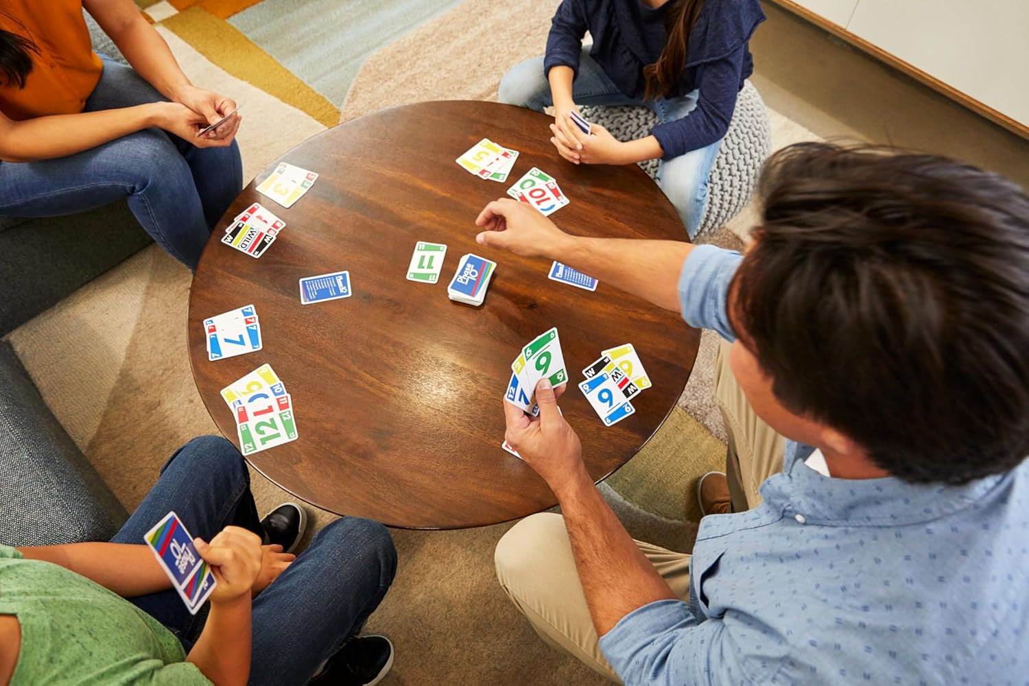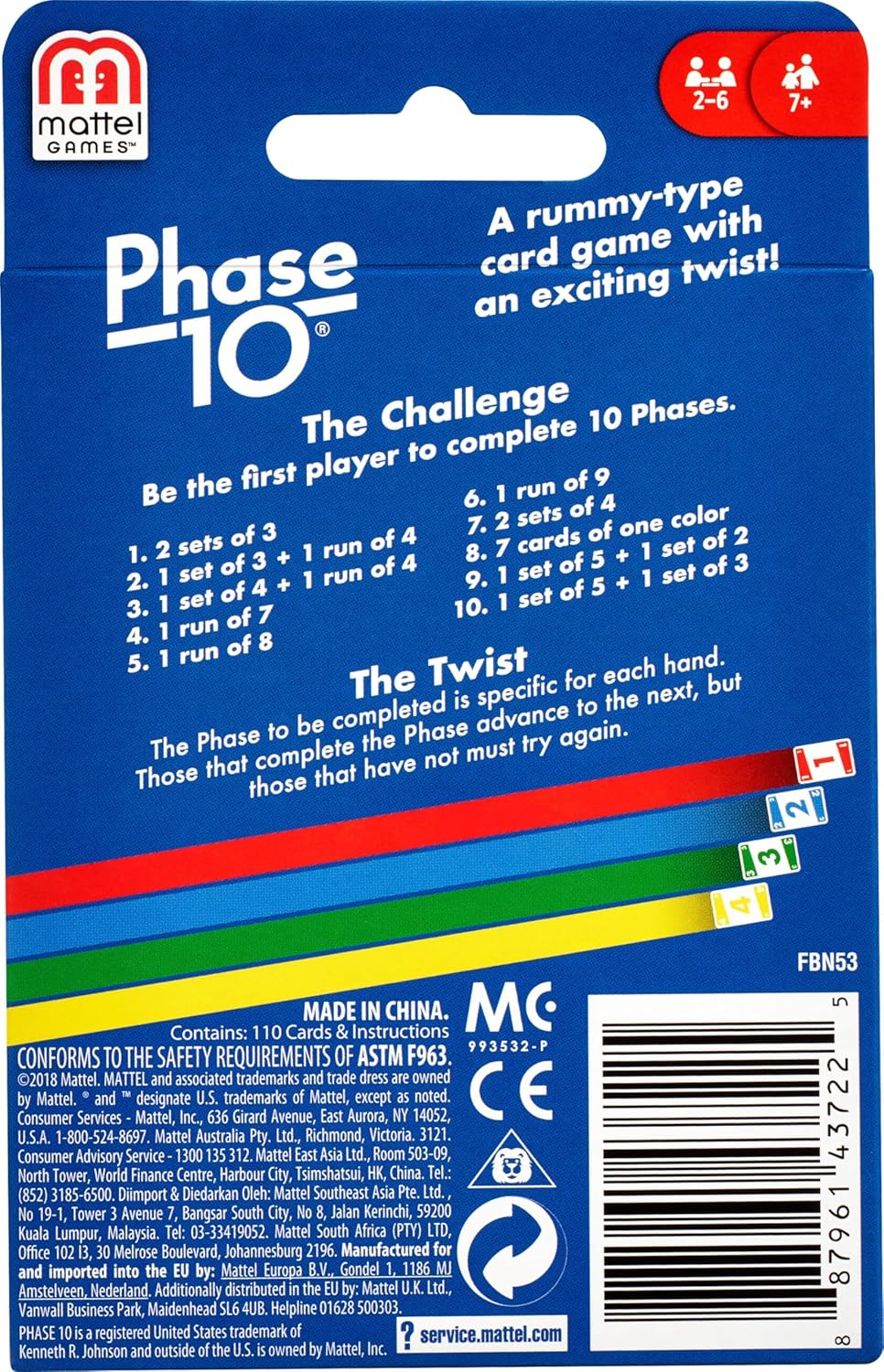 Mattel Phase 10 Card Game A" Fun for Family & Kids Experience a fun twist on the classic rummy game with Phase 10! Challenging Gameplay: Be the first to complete 10 phases using combinations like two sets of three, a run of seven, or seven cards of the same color. Wild & Skip Cards: Add excitement and strategy with Wild cards (substitute for any card) and Skip cards (make opponents lose a turn). Colorblind Accessible: Special graphic symbols on each card help players of all abilities identify colors, making it easy for everyone to play. Family Fun: Ideal for family game nights, perfect for 2-6 players and ages 8+. Complete Set: Includes 108 cards and instructions for endless fun! Get ready for endless excitement and twists in this fast-paced, strategic card game!