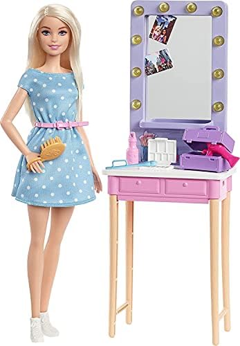 Product Description Inspire adventures under the city lights or the spotlight with Barbie: Big City, Big Dreams dolls and playsets! This playset takes imaginations backstage to help Barbie "Malibu" Roberts doll get performance ready. A dressing table with a vanity mirror and stool provide space for Barbie doll to perfect her lyrics and her look. Key Features: Join Barbie and her friends on their biggest adventure yet with Barbie: Big City, Big Dreams dolls and playsets!,This playset takes imaginations backstage to help Barbie "Malibu" Roberts doll get performance ready with her stylish dressing table and vanity mirror.,A stool provides seating, and storytelling accessories like a hairbrush, hairdryer, makeup compact, carrying case and more prepare her for the spotlight!,Inspired by an onscreen look, Barbie doll wears a blue polka-dotted dress with a pink belt and white shoes.,With Barbie: Big City, Big Dreams dolls and playsets, kids ages 3 to 7 years old can imagine all kinds of stories under the city lights or the spotlight! This product is designed with premium quality, ensuring durability and superior performance.