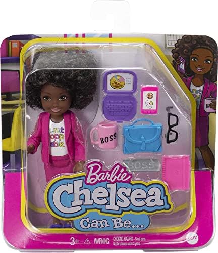 Barbie - Barbie Chelsea Can Be Anything Doll & Playset Brunette Boss Small Doll with Curly Hair Outfit & 7 Career Accessories