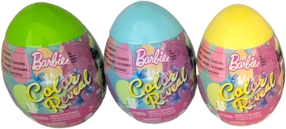 Product Description Barbie Color Reveal Baby Doll 5 Surprises Water Reveal Sand & Sun Series (Pack of 3 Bags). Key Features: Barbie Color Reveal Babies Easter Egg HJX67 Series Colored Egg Surprises Pack of 3 Random Eggs Bundle,Kids can 'crack' open these brightly colored Easter Eggs to discover Barbie Color Reveal baby doll sets with unboxing surprises -- five of them -- that celebrate the spring holiday with iconic pieces!,Open the egg-shaped case and find one of five possible dolls covered in a Color Reveal shimmery pink coating, each with a different look and accessories that include bunny ears and cute skirts Color-change effects on the doll's bodice add more wow.,The egg-shaped case is perfect to store the accessories and other favorites when play is over.,For Barbie fans ages 3 and up This product is designed with premium quality, ensuring durability and superior performance.