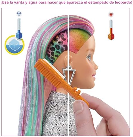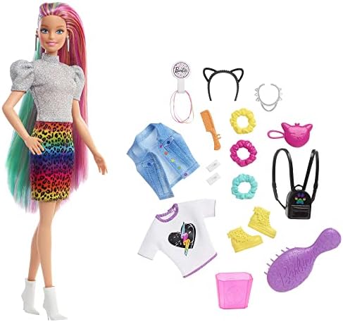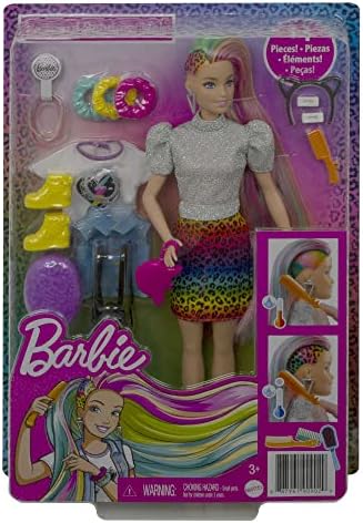 nan Key Features: Explore a variety of imaginative styles and looks with the Barbie Leopard Rainbow Hair doll (12-in/30.40-cm).,Brush Barbie doll's long rainbow-colored hair to the side to reveal a beautiful ombre rainbow look! Then activate the color-change feature by adding cold water on the side and watch a leopard print appear! So cool!,Create multiple mix and match outfit combinations and all kinds of hairstyles with 16 hair and fashion play pieces-- including scrunchies that work on Barbie doll's hair!,Barbie Leopard Rainbow Hair doll comes with these super-stylish items perfect for young stylists and fashion fun: 2 hair pins, 3 scrunchie bracelets (also work on Barbie doll's hair), hair bands, a brush, a heart T-shirt, jean vest, cat ears, and more,makes a great toy for kids 3 to 7 years old especially those who love exploring new looks, hairstyling and fashion! This product is designed with premium quality, ensuring durability and superior performance.