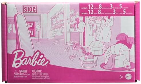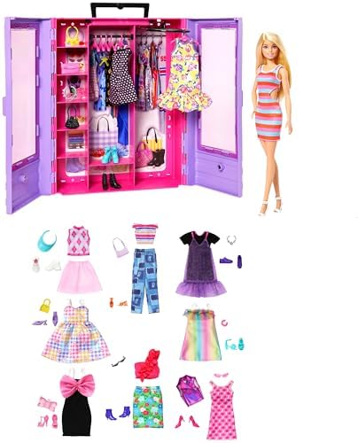 Product Description The Barbie Ultimate Closet is not only designed for portability with a carrying handle, but it also features Barbie doll plus clothing and accessories for unlimited styling possibilities! Decorated with Barbie signature style, the purple closet with pink interior features clear doors for a peek into her wardrobe. Barbie doll wears a striped dress plus shoes and comes with trendy mix and match clothing and accessories. Two dresses are perfect for day or night with modern prints and popular colors along with two pairs of shoes, two necklaces and two purses. Key Features: The Barbie Ultimate Closet playset includes Barbie doll, clothing and accessories and has style inside and out.,The closet has a purple exterior with a pink interior and is decorated with clear double doors for a glimpse into Barbie doll's wardrobe.,A fold-out rack is used to hang clothes and is handy for dress-up style changes Six hangers are also included.,Barbie doll wears a striped dress and has two additional dresses to switch up her outfit.,Three pairs of shoes, two necklaces and two purses create different looks in an instant.,A carrying handle makes it easy to store away or take on the go.,Mix and match for fashion play and styling fun. This product is designed with premium quality, ensuring durability and superior performance.
