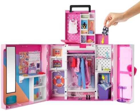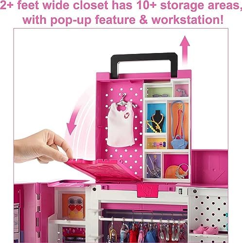 Product Description The Barbie Dream Closet inspires kids to create endless looks and unlimited story possibilities! This modern pink closet opens 2+ feet wide (60+ cm), has 15+ storage spaces including a pop-up hanging area that creates a second story, a hamper chute, a full length mirror and desk space. Also includes 35+ fashions and accessories (doll not included) for 400+ looks. Kids can use the doll stand and mirror to model their looks; put laundry in the hamper chute and use the desk space for more storytelling fun. Key Features: The Barbie Dream Closet opens to reveal a play space 2+ feet wide (60+ cm) with 15+ storage areas, a second story pop-up hanging area, a hamper chute, full-length mirror, desk space plus 35+ fashions and accessories for 400+ looks!,Includes 5 outfits -- there's a shimmery pink one-shoulder party dress, a cute floral print dress, a trendy top and skirt, a lifeguard outfit with shorts and tank top and a nurse scrub outfit with top and pants.,The closet has a surprise pop-up hanging area that creates a second story and more room for hanging and storage and kids can put laundry in the hamper chuteso fun!,Once an outfit is chosen, place Barbie doll (not included) in the stand to style the finishing touches and check it out in the full-length mirror Accessories include 5 pairs of shoes, jewelry, a visor, a purse, laptop, otoscope, whistle and more.,Kids can seat Barbie doll (not included) in the chair and use the desk and computer to play out stories with friends.,Use the 10 hangers to hang the doll clothing; additional storage includes shelves and a clothing hamper.,Close to store when playtime is over; use the carrying handle to take on the go.,Kids can play out fashion stories with Barbie doll (not included) and her Dream Closet -- makes a great gift for kids 3 years old and up, especially those who love to play dress up! This product is designed with premium quality, ensuring durability and superior performance.