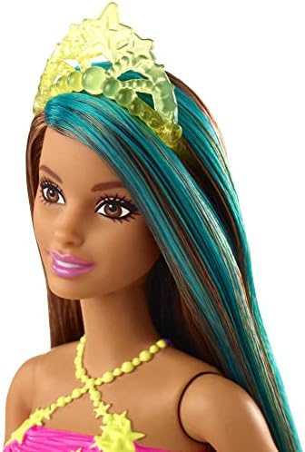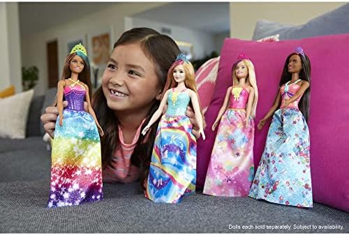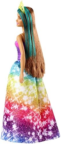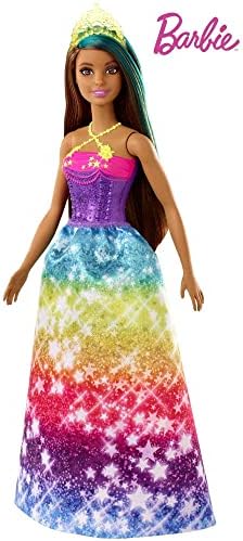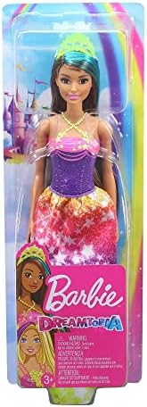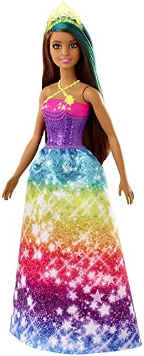 Product Description Princess dolls from Barbie Dreamtopia bring fairytale dreams to life in fantastical looks with colorful touches! This Barbie princess doll is dressed for a royal occasion in a sparkly purple and pink bodice and vibrant skirt with a starry rainbow print. A teal streak in her brunette hair adds a splash of color, and a bright tiara completes her fantastical look. Key Features: Princess dolls from Barbie Dreamtopia inspire royal adventures in fairytale fashions!,This princess doll from Barbie Dreamtopia wears a sparkly bodice and colorful skirt with a starry rainbow print.,A yellow tiara and matching shoes complete her fantastical look.,A blue highlight in Barbie doll's long, brunette hair adds another touch of color.,Barbie Dreamtopia dolls and toys make the perfect gift for fairytale lovers 3 to 7 years old Kids can collect all the Dreamtopia dolls and toys to let their stories take flight! Each sold separately, subject to availability. This product is designed with premium quality, ensuring durability and superior performance.