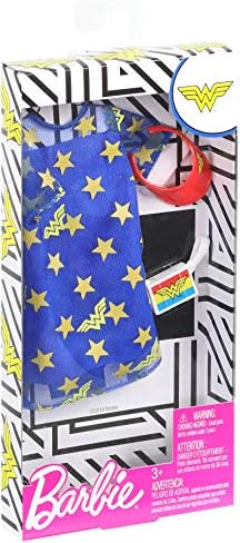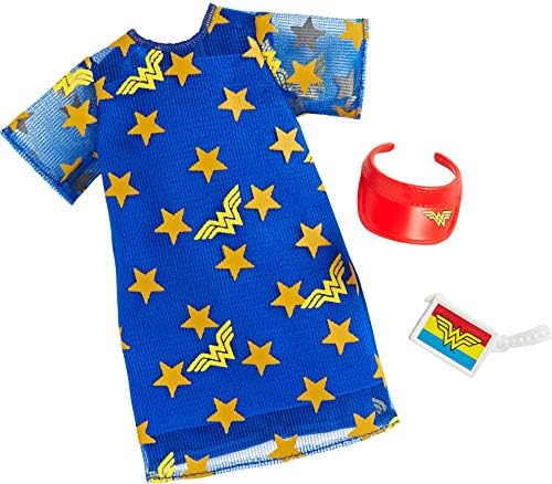 Product Description Barbie doll (sold separately) loves to put her own twist on the latest fashion trends. And she's captured some of her favorite influences in this cool collection of clothing. This complete Barbie look -one outfit and accessories -incorporates recognizable icons inspired by favorite Super Hero Wonder Woman. Mix and match with other clothing in the line to create different looks and explore your style. Key Features: This trendy fashion pack for Barbie doll (sold separately) features an outfit and accessories inspired by DC Comics fan-favorite, female Super Hero Wonder Woman.,The blue dress has a cool print with stars and the Wonder Woman logo.,A red visor and colorful clutch both sport a Wonder Woman graphic to complete the look.,Mix and match with other Barbie doll clothes to encourage imaginations and storytelling fun!,Collect them all to expand Barbie doll's wardrobe and the possibilities for exploration because when a girl plays with Barbie, she imagines everything she can become (each sold separately, subject to availability). This product is designed with premium quality, ensuring durability and superior performance.