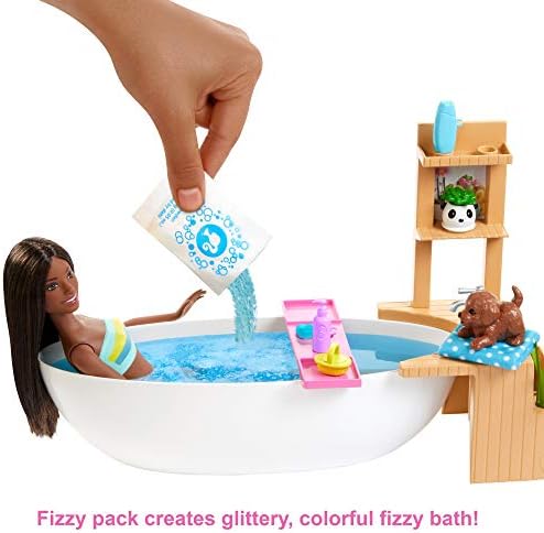 Barbie - Barbie Fizzy Bath Doll and Playset Brunette with Tub Fizzy Powder Puppy and More Gift for Kids 3 to 7 Years Old