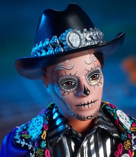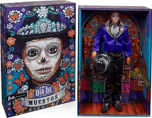 Product Description The Barbie DAa De Muertos series honors the customs, symbols and rituals often seen throughout the festive time of remembrance. Ken doll is strikingly handsome in a blue jacket with embroidered bone detail at the lapels. A sugar skull-accented hat frames his calavera face paint. May the 2023 DAa De Muertos Ken doll become a treasured holiday tradition! Includes doll stand and Certificate of Authenticity. Doll cannot stand alone. Key Features: Celebrate DAa De Muertos 2023 with a collectible Barbie doll! Ken wears a satin suit that pays homage to the traditions, symbols and rituals of this time-honored holiday.,Ken doll commemorates the occasion dressed in a dark blue jacket with embroidered sugar skull and bone details on the lapels.,A stunning sugar skull band wraps around his hat and accentuates his intricate calavera face paint.,A silvery striped undershirt, elegant trousers and matching black boots complete his sophisticated ensemble.,The 2023 Barbie Ken DAa De Muertos doll comes in deluxe packaging and is perfect for display May he fill your holiday with joy as you celebrate the memories of loved ones! This product is designed with premium quality, ensuring durability and superior performance.