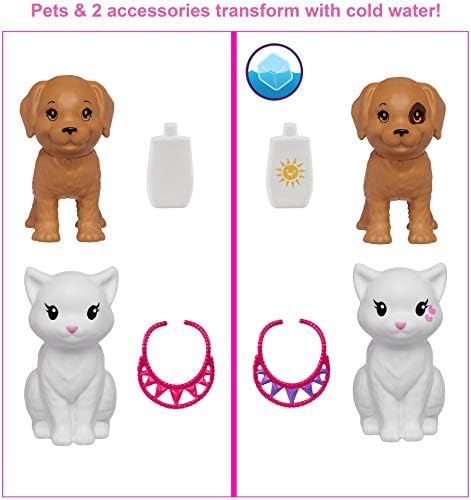 nan Key Features: The Barbie Color Reveal dolls deliver the ultimate delight with 25 surprises and lots of transformation -kids unbox this multi-piece set to find a Color Reveal Barbie doll, 2 Color Reveal pets, 2 complete looks and 8 color-change features that include 2 long-haired wigs!,Kids can start the experience by opening the package and removing the 15 mystery bags with hidden contents -it's easy with punch-put panels in the back!,Next free the center tube and pull the strip to remove the outer layer and reveal the metallic golden doll inside -so cool!,Remove the doll and fill the tube with warm water, then dip the doll in and swirl her around -the water turns golden for a magical effect! Pull out the doll to reveal her look.,Each doll has a different combination of eye color, hair color, skin tone and decorated leotard -which will you reveal,Open the 15 mystery bags to reveal their surprises -2 Color Reveal pets, 2 color-change long-haired wigs, 2 outfits, 2 bags, a small sponge and additional themed accessories, like shoes and jewelry; store them in the tube after play!,Reveal the 2 pets in the same way the doll was revealed -they will each change clear water a different color, like pink or green!,For even more transformation, dip the sponge in ice cold water and use on the color-change pieces -2 long-haired wigs, 2 pets, 2 accessories and Barbie doll's hair and face -for a new look.,Dress and accessorize the doll to play out stories -each can go from day to night with popular themes like beach to party, carnival to concert and dog park to movie night!,Kids can collect them to mix and match accessories and expand the playtime opportunities -they make a great gift for kids 3 to 7 years old! This product is designed with premium quality, ensuring durability and superior performance.