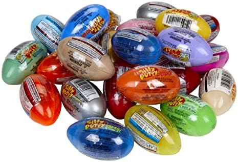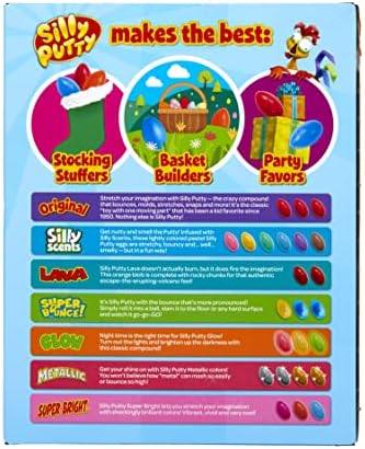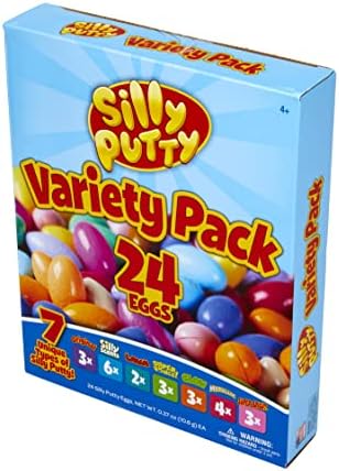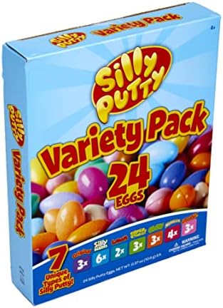 Product Description Welcome to the wacky world of Silly Putty, and what better way to dive in than with The Crayola Silly Putty Variety Pack! This bulk pack of Crayola Silly Putty includes Original Putty (3), Silly Scents (6), Lava (2), Super Bounce (3), SuperBright (3), Metallic (4), and Glow (3). Switch up the putty toys in your pocket by the day or share and trade with friends! With 24 egg toys in this pack, there's even enough to share with a classroom. Key Features: CRAYOLA SILLY PUTTY BULK: Features 24 Putty Toys including Original Putty (3), Silly Scents (6), Lava (2), Super Bounce (3), Metallic (4), SuperBright (3), and Glow (3).,STRETCHABLE AND MOLDABLE: Stretch it, snap it, sculpt it, or roll it in a ball and bounce it! This lightweight, stretchable putty provides endless possibilities for creative play.,GREAT FIDGET TOY: This set is not only great for tactile play, but it can also be used as a fidget toy for kids Squeeze, stretch, and mold the putty to help relieve stress and anxiety, and improve focus and concentration.,IDEAL FOR GOODIE BAGS AND TREASURE BOXES: Perfectly sized for goodie bags, party favors, and treasure boxes, adding joy and excitement to any event.,GIFT FOR KIDS: A great gift for boys and girls on birthdays, holidays, or everyday gifting occasions This Silly Putty set is sure to provide hours of fun and entertainment.,SAFE AND NONTOXIC: Safe and nontoxic, great for kids ages 4 & up. This product is designed with premium quality, ensuring durability and superior performance.