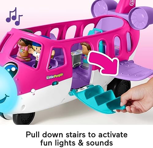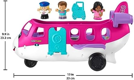 Product Description Kids can take off to imaginary adventures with Barbie's Little Dream Plane, presented by Little People. This push toy lights up and produces fun music, sounds and expressions when pressed on his nose, to stimulate your little one's imagination. Kids can set up all three figures on board the plane, pack away luggage, serve drinks with the trolley and fly the crew and passengers to great Barbie adventures. Key Features: The Barbie Dream Plane makes its debut into the world of Little People with its lights, sounds and fun expressions to boost role play in toddlers (18 months to 5 years),Press the captain's seat or open the door to light the nose of the plane, which produces fun expressions, sounds and music Press the globe button to choose language: English, German, French,The door opens and unveils the staircase allowing passengers to board it Features seven seats for adventure with Little People figures (Additional figures sold separately Some products may not be marketed.),Who wants to drink something? Children can run the beverage trolley in the aircraft aisle to serve passengers.,Set includes 1 airplane, 1 Barbie figure, 1 Ken figure, 1 pilot figure and 1 luggage element This product is designed with premium quality, ensuring durability and superior performance.