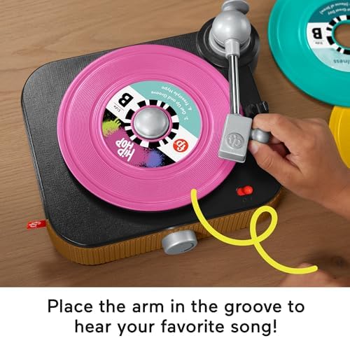 Product Description Preschool kids can turn the tables on fun with the Rockin Record Player musical toy from Fisher-Price. Young DJs will love picking out songs to play from the 5 colorful, double-sided ArecordsA that play 20 unique songs. Just like the real thing, kids can place the playerAs arm and see the record spin on the turntable as it plays! Records come in fun, decorative sleeves that can be stored in the included play rack. (Toy record player does not play real records. Key Features: Toy record player with a rotating turntable lets kids rock out to music in a fun, retro way,20 unique songs in 5 cool musical styles! Choose from Country, Pop, Mindfulness, Kids Classics & Hip-Hop,Kids control the play: Place the record arm into the groove to hear songs; use the knob to adjust the volume,Includes 1 turntable, 1 display rack, 5 records with decorative sleeves,Encourages self-confidence and pretend play for preschool kids ages 3 years & older,Smilestones: Bringing a smile to milestones! This toy fosters Independence by letting kids customize their listening experience & encouraging self-regulation through open-ended play This product is designed with premium quality, ensuring durability and superior performance.