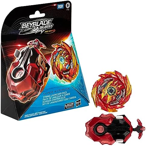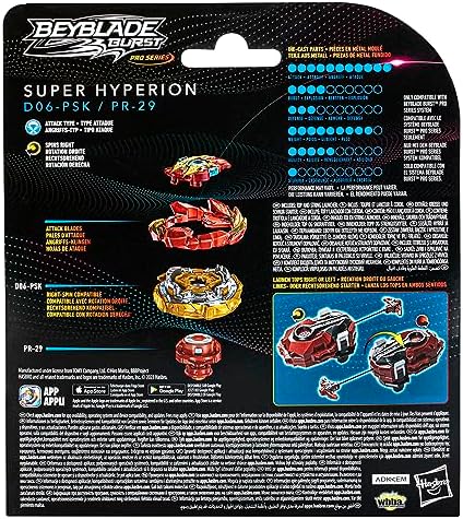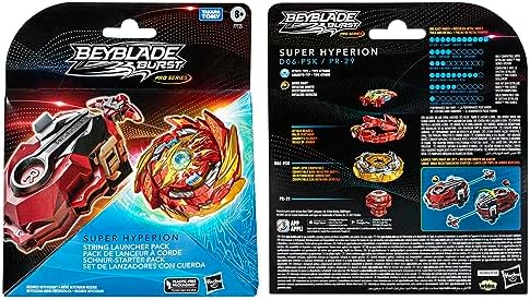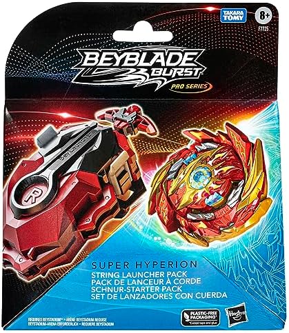 Product Description Bladers can take on the elite using the authentic Beyblade Burst Pro Series combat system inspired by Japan! The Beyblade Burst Pro Series spinning tops and launchers and the Beystadium Pro Series arena have authentic components and combat performance features. A Beyblade rope launcher allows you to launch quickly without inserting a rack! In addition, it is easy to change its direction of rotation. This Super Hyperion Rope Launcher Pack includes 1 Beyblade Burst Pro Series Right/Left Spin Launcher, Sticker Sheet and 1 Super Hyperion D06-PSK PR-29 Attack Type Right-Spin Competition Spinner. Key Features: PRO SERIES ROPE LAUNCHER: Inspired by Takara Tomy Beyblade launchers, this right/left-spin rope launcher offers improved casting technique and eliminates the need to insert a rack,AUTHENTIC JAPAN-INSPIRED SPIRIT: The Beyblade Burst Pro Series features spinning tops with the authentic cast metal parts, design and decor of Superking Takara Tomy products as sold in Japan,FACE THE ELITE: Includes a Super Hyperion D06-PSK PR-29 straight-spin attack top including a rubber performance tip with spin protector, dual chassis and large attack blades to fight the opponent's spinning top,DIGITAL FIGHTS: Bladers can scan the code on Beyblade Burst Pro instructions to fight like a pro in the Beyblade Burst app using their launcher and spinning tops in virtual battles with Bladers from around the world!,HYPERVITESS: You can engage in duel battles with Beyblade Burst Beystadium arenas, pitchers, and spinning tops while riding like Blader (Sold separately, while stocks last.) This product is designed with premium quality, ensuring durability and superior performance.