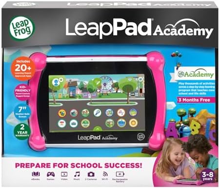 Product Description Inspire school success with LeapPad Academy. This learning tablet includes 20 educator-approved apps that build reading, math and science skills, explore creativity and more. Expand vocabulary with a word of the day, draw masterpieces and bring them to life with Art Studio Ultra and explore nature during a field trip to the forest with Ms. Giraffe. Kid-friendly right out of the box, this tablet has a stylus, tough bumper with a built-in kickstand and a 7a shatter-safe screen. Parent controls can be used to set time limits and expand content. Key Features: Enjoy a kid-friendly tablet with Android thataTMs packed with 20 educational apps and creativity tools designed by LeapFrog learning experts,Explore LeapSearch, LeapFrogaTMs kid-friendly web browser and add to the learning with kid-friendly websites and videos,Includes a free three-month trial of LeapFrog Academy, an interactive learning program that progressively guides children on learning adventures,Parents can download popular Android apps or choose from hundreds of games, apps, videos and music (sold separately) from the LeapFrog App Center,Intended for ages 3-8 years; rechargeable lithium ion battery included This product is designed with premium quality, ensuring durability and superior performance.