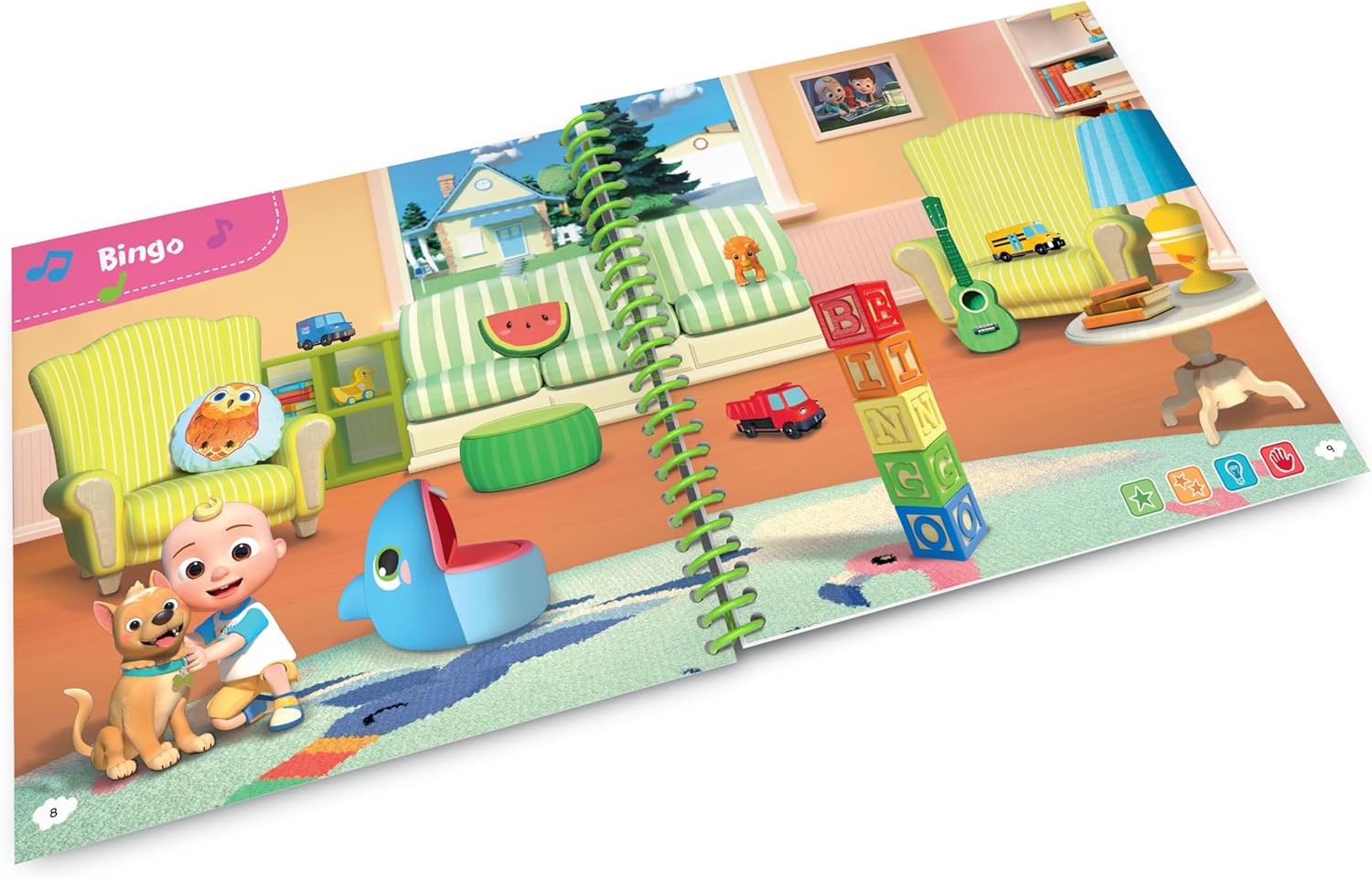 LeapFrog LeapStart CoComelon Sing and Learn " Interactive Learning Toy with Songs Sing along with five popular songs from CoComelon episodes, including "Wheels on the Bus," "Counting Apples on the Farm," and "B-I-N-G-O," in this fun activity book. Join JJ and his friends as they explore numbers, letters, shapes, daily routines, and puzzles through 25+ engaging and replayable activities. The toy features familiar characters from the show like JJ, Yoyo, Tome Tom, and Cody, offering a fun way to learn while playing. Tap on the words and pictures with the stylus to start interactive audio activities, enhancing your child's learning experience. A computer with internet is needed to download the audio to the LeapStart system (sold separately). This toy is ideal for children aged 2-5 years and does not require batteries.