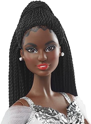 Mattel - Barbie Signature 2021 Holiday Doll (12-inch Brunette Braided Hair) in Silver Gown with Doll Stand and Certificate of Authenticity Gift for 6 Year Olds and Up