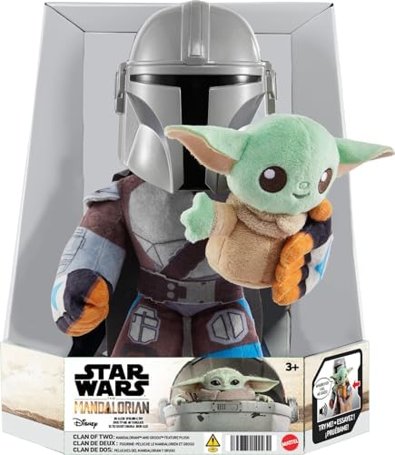 Product Description The Star Wars Clan of Two: Mandalorian and Grogu plush highlights the bond between Grogu and his adoptive father, the Mandalorian, aka Din Djarin. At 11 inches tall, the Mandalorian plush has a sculpted head on a soft plush body, while the smaller Grogu plush rests safely in his arms or detaches for even more play and cuddling opportunities. Squeeze the Mandalorian's hand for iconic phrases from the show and Grogu's signature soft vocals. Two plush in one package, this is perfect for Star Wars fans of all ages 3 years and up. Key Features: Star Wars Clan of Two: Mandalorian and Grogu plush set comes to life with sound -squeeze the Mandalorian's hand for iconic phrases from content and Grogu's signature babble!,Approximately 11 inches tall, The Mandalorian plush figure features a detailed plastic head on a soft plush body; the smaller Grogu soft doll, about 4 inches is a pillow-like plush.,Celebrating the bond between the two, Grogu rests in the Mandalorian's arms or detaches for even more play opportunities.,The two-in-one collectible set is perfect for cuddling or displaying in the home.,Makes a great gift for Star Wars fans of all ages 3 years old and up! This product is designed with premium quality, ensuring durability and superior performance.
