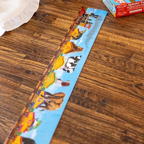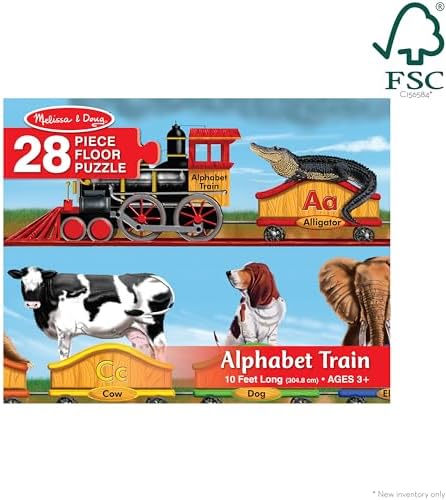 Product Description Product Description All aboard the Alphabet Train! The beautifully detailed blue engine is ready to roll with familiar objects from A to Z. Ten feet long when assembled, this sturdy, colorful puzzle will stay looking like new, thanks to its "Easy-Clean" surface and extra-thick pieces.Children will love the large, thick pieces of this Melissa & Doug puzzle, which are easy to handle and put together. The finished puzzle displays beautiful original artwork which can inspire conversations and learning. Our kids alphabet train A puzzle is designed to help children develop problem-solving skills and hand-eye coordination. Key Features: 28 extra-thick cardboard pieces,Beautiful original artwork,Easy-Clean surface keeps puzzle looking new.,Promotes hand-eye coordination and problem-solving skills.,10 feet long when assembled; product made with FSC-certified materials that support responsible forestry; applies to new inventory only (FSC C156584) This product is designed with premium quality, ensuring durability and superior performance.