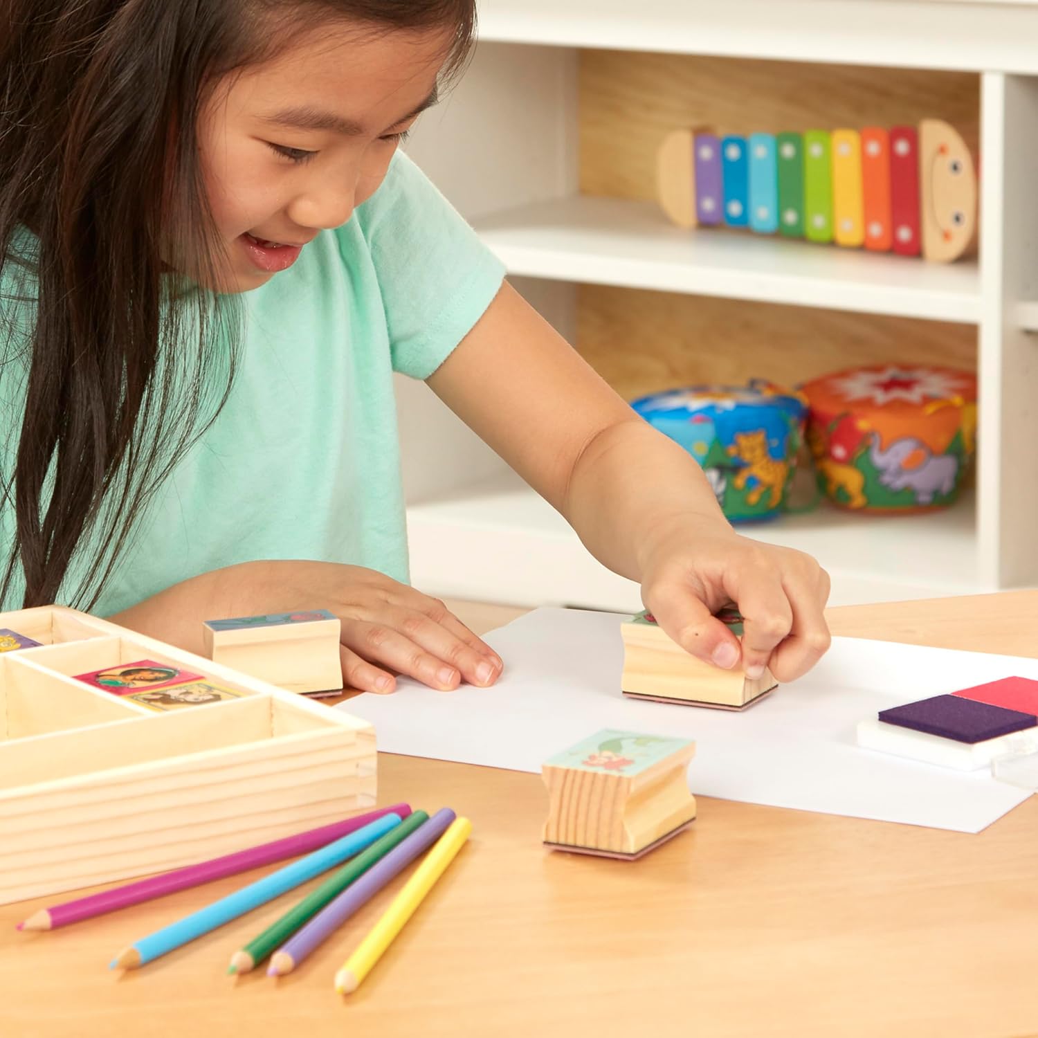 Melissa & Doug Disney Princess Wooden Stamp Set The Melissa & Doug Disney Princess Wooden Stamp Set is the perfect creative toy for young Disney fans to enjoy artistic play while developing fine motor skills. Key Features: Disney Princess Theme: Includes 9 wooden stamps featuring beloved Disney Princess characters, perfect for creating colorful designs and stories. Complete Set: Comes with 5 colored pencils and a 2-color stamp pad, offering everything needed for a complete stamping experience. Washable Ink: The ink is washable, making cleanup easy and hassle-free. Storage Box: All pieces are stored in a sturdy wooden box, keeping the set organized and easy to access. Skill Development: Encourages creativity, fine motor skills, and imaginative play as kids create their own stamp art. Ideal for children aged 4-10, this stamp set is a fantastic gift that fosters hands-on, screen-free play while allowing kids to express themselves through art!