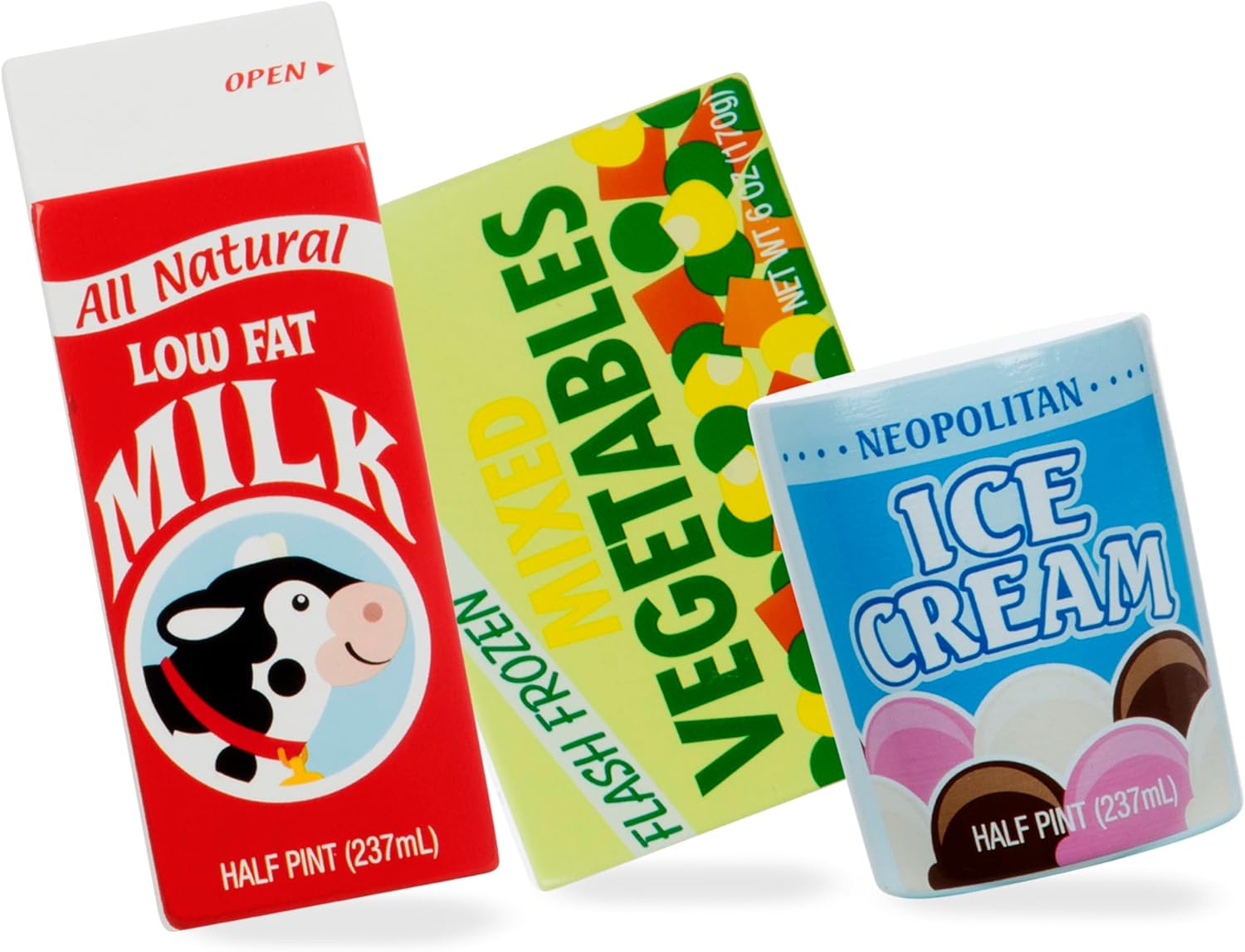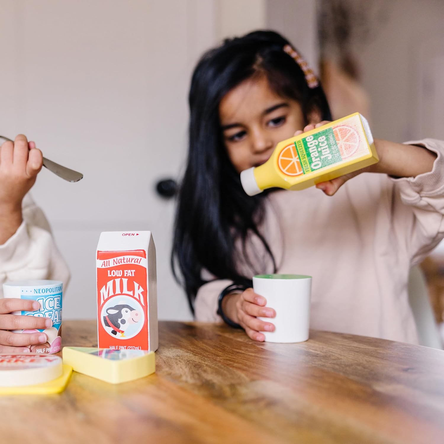 Melissa & Doug Fridge Food Wooden Play Set " 9 Pieces, Ages 3+ Fun & Realistic Play Food: Includes 9 wooden food pieces such as waffles, milk, ice cream, cheese, yogurt, and more, perfect for pretend play in the kitchen. Encourages Creativity: Ideal for imaginative play in pretend kitchens, grocery stores, or restaurants, allowing children to create their own scenarios. Educational Benefits: Helps children learn basic shape, color, word, and number recognition through hands-on interaction with the food pieces. Durable & Safe: Crafted from sturdy wood for long-lasting fun and designed with safety in mind. Great Gift for Ages 3-5: A wonderful gift that encourages screen-free play and promotes the development of fine motor skills and creativity. This delightful wooden play set is the perfect tool for inspiring young chefs and sparking hours of pretend fun!