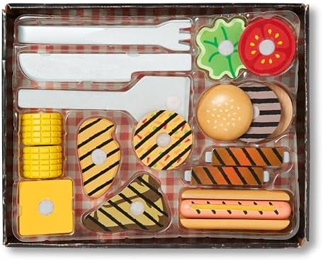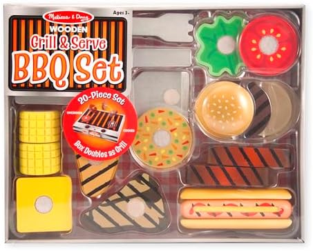 Product Description Product Description Fire up the imagination while firing up this pretend play BBQ with all the "fixins" for a fantastic feast! The 20-piece wooden food set includes grilling favorites like hotdog, hamburger, chicken, steak, ribs, veggie burger, and corn, plus tasty toppings and sturdy utensils. Flip the sturdy corrugated box over and it becomes the "grill," with pictures of knobs for adjusting the temperature and four self-stick tabs to hold the food. Key Features: 20-piece set with wooden food items to grill and prepare using pretend BBQ printed on back of sturdy corrugated storage box,Includes wooden meats, vegetarian options, utensils, "fixins," and a paper checkered serving mat,Double-sided pieces show one side uncooked and the other cooked,Easy-to-grasp spatula and tongs are safe and kid-friendly; self-stick tabs keep food on the grill and make satisfying crunch,Promotes hand-eye coordination, creative expression, and imaginative play This product is designed with premium quality, ensuring durability and superior performance.