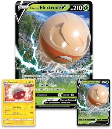 Product Description Take your opponent by surprise and execute an explosive comeback with Hisuian Electrode V! This Grass-type PokAmon becomes even more powerful when affected by Special Conditions and can do up to 300 damage for zero Energy, so don't be afraid to take risks! You'll find Hisuian Electrode V as a foil promo card in playable and oversize versions, along with a foil card featuring the Lightning-type Electrode from the Kanto region. Key Features: 1 foil promo card featuring Hisuian Electrode V,1 foil card featuring Electrode,1 oversize foil card featuring Hisuian Electrode V,4 PokAmon TCG booster packs,A code card for PokAmon TCG Live This product is designed with premium quality, ensuring durability and superior performance.