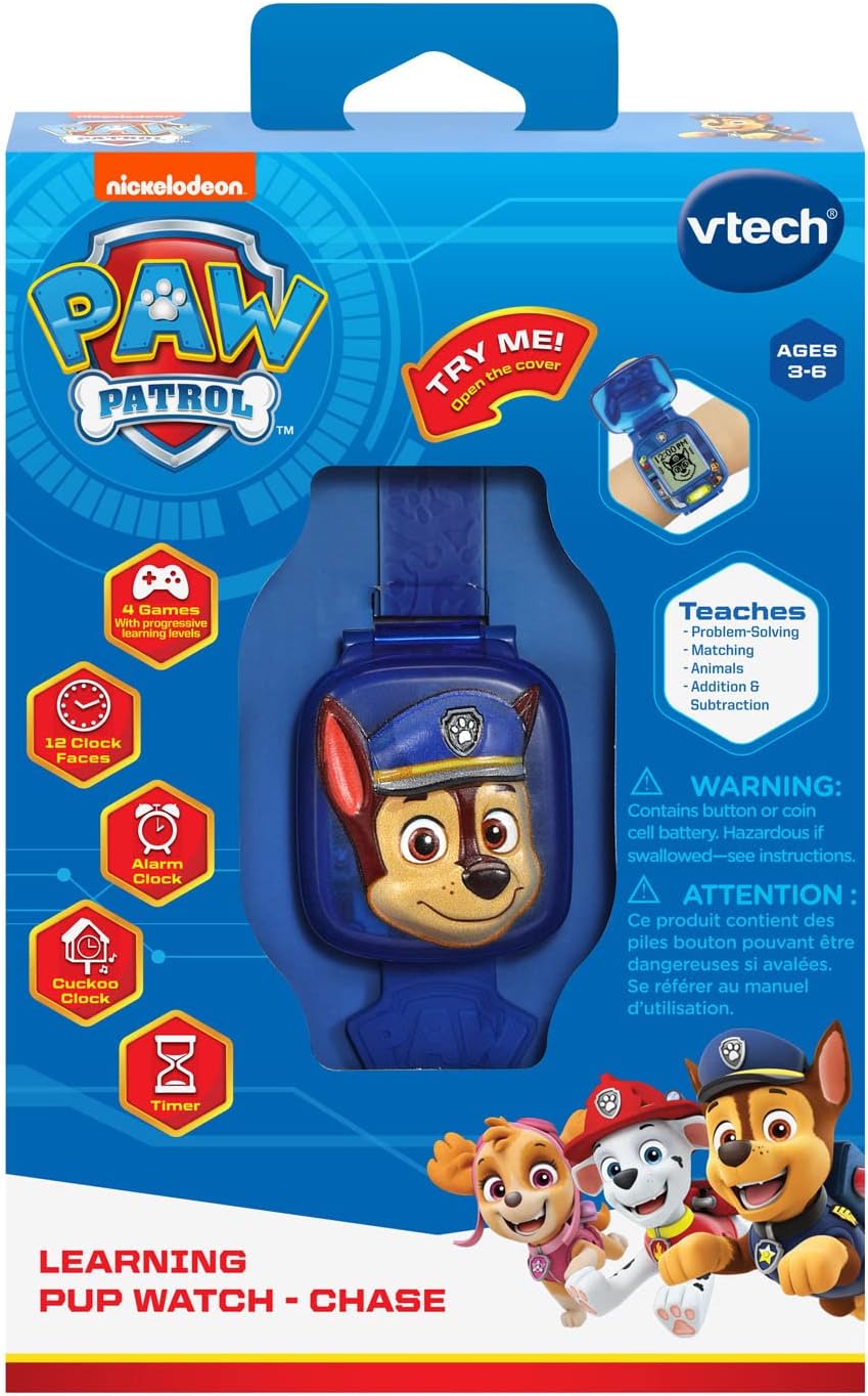 VTech PAW Patrol Chase Learning Pup Watch " Interactive Fun for Kids Adventure Time with Chase! PAW Patrol-Themed Smartwatch: This wearable gadget features a 3D Chase cover and exciting characters from PAW Patrol for an engaging, interactive experience. Multiple Clock Features: Kids can choose from 12 digital clock faces and enjoy a stopwatch, timer, and alarm with fun PAW Patrol-themed alarm tones. Educational & Fun Games: Four interactive learning games help build matching, problem-solving, and math skills, all featuring favorite PAW Patrol pups. Interactive Voice & Sound Effects: Learn and play with the voice of Ryder while exploring exciting adventure games with Chase and his team. Perfect for Young PAW Patrol Fans: Designed for kids ages 3-6, this fun learning watch requires 1 CR2450 lithium coin battery (included for demo use, new battery recommended for regular play). Gear up for learning fun and adventure with Chase and the PAW Patrol team!