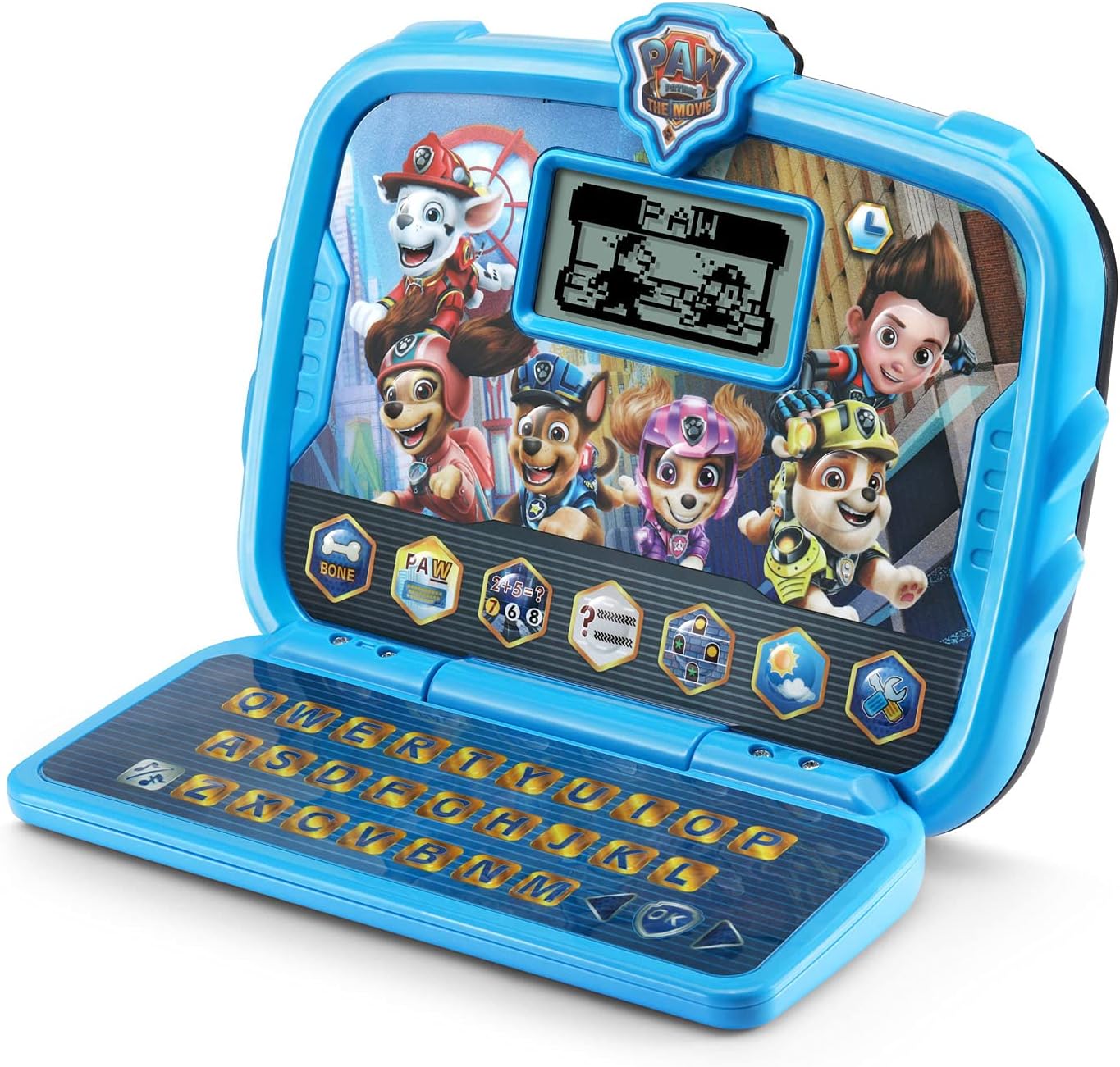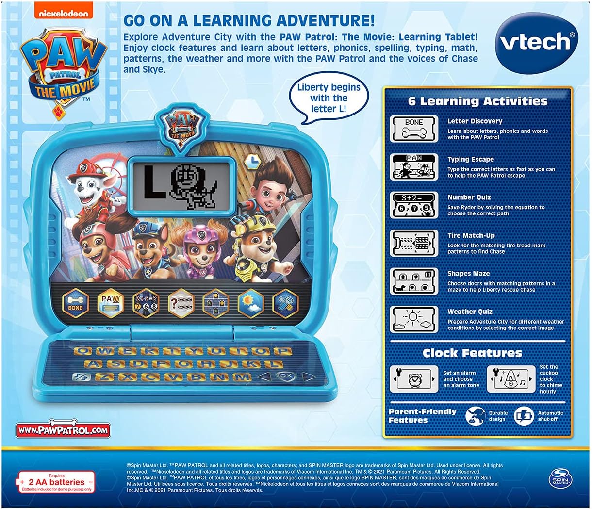 VTech PAW Patrol Learning Tablet " Interactive Educational Toy (Blue) The VTech PAW Patrol Learning Tablet brings the excitement of PAW Patrol: The Movie to life with interactive learning activities featuring Chase, Skye, and the Adventure City team. This educational toy helps kids learn letters, phonics, spelling, math, patterns, and more while engaging with their favorite PAW Patrol characters. Key Features: Official PAW Patrol Characters & Voices " Features animations and real voices of Chase and Skye for an engaging experience. Six Learning Activities " Teaches letters, phonics, spelling, typing, math, patterns, and weather through fun games and challenges. Interactive Clock Features " Includes an alarm clock and cuckoo clock, with six clock faces and customizable alarm tones. Portable & Kid-Friendly Design " Perfect for on-the-go learning and home play. For Ages 3-6 Years " Designed to support early childhood learning in a fun and engaging way. Battery-Powered " Requires 2 AA batteries (included for demo purposes, new batteries recommended for regular use). This engaging educational tablet is a great gift for young PAW Patrol fans, making learning PAWsome and fun!