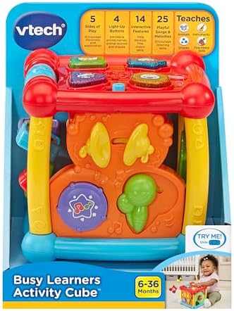 Product Description Exploration and fun is around every corner with the Busy Learners Activity Cube by VTech. Featuring multiple games & challenges to explore, this 6 sided activity cube attracts your baby's attention and encourages imaginative play with music, light-up buttons, colors and more. Shape and animal buttons introduce animal names, animal sounds and shapes; press-and-slide musical instrument buttons introduce instrument names, sounds and colors. Sliding, spinning blocks promote interaction and fine motor skill development. The infant learning cube also plays fun sounds when it's moved. It Includes 25 sing-along songs and melodies. Key Features: Toddler Activity Cube: 5 sides of play encourage discovery and exploration; 4 light-up buttons introduce your baby to animal names, animal sounds and shapes,Pre-K Learning Toy: This alphabet activity cube has 14 interactive features that develop fine motor skills for any growing mind; your little one will learn colors, shapes, and more,Learn to Crawl: Motion sensor activates fun sounds when the activity cube is moved to attract your little one's attention and even assists babies with sitting up to play,Early Learning Center: The Busy Learners Activity Cube features 25 playful songs and melodies that keep toddlers engaged, entertained, and learning for hours volume control for quieter play,Special Features: Volume is adjustable & includes auto shut-off feature; 2 AA batteries are included for demo purposes only; ages 6 months to 3 years old This product is designed with premium quality, ensuring durability and superior performance.