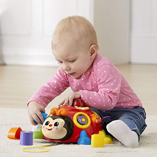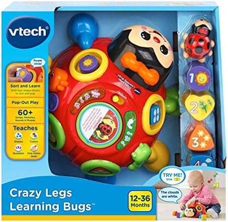 Product Description Wobbly surprises await with the Crazy Legs Learning Bugs interactive pull toy! Children can sort and pop shapes as they sit on the floor and use the storable cord to pull it when they start to toddle. This adorable bug has four easy-grasp, colorful shape blocks for sorting. Place them in the matching slots on mommy ladybug's back to learn about shapes, colors, numbers and nature objects. Key Features: Crazy, wobbly ladybug pull toy and bug friends teach shapes, colors, numbers and nature,Two bug friends introduce sounds and music with light-up buttons on the ladybug's back,Flip the butterfly wing, twist the caterpillar and turn the baby ladybug to practice motor skills,Sort the colorful shape blocks and then pop them out by pressing the baby ladybug on the mommy ladybug's back,Intended for ages 12-36 months Requires 2 A batteries Batteries included for demo purposes only New batteries recommended for regular use This product is designed with premium quality, ensuring durability and superior performance.
