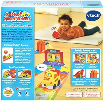 Product Description Grab the remote controls and race a friend with the Go! Go! Smart Wheels RC SmartPoint Racer 2-Pack by VTech! Race the toy race cars on the Go! Go! Smart Wheels Ultimate RC Speedway (sold separately), hear the electronic vehicles respond to the SmartPoint locations with different phrases and sound effects, and watch them activate four action zones. Each RC SmartPoint Racer and remote set has three frequencies. Match the frequency of a remote to a racer so your child can race up to 3 at once (additional vehicle sold separately). Key Features: Race on the Go! Go! Smart Wheels Ultimate RC Speedway (sold separately),Hear the electronic race cars respond to SmartPoint locations with different phrases and sound effects,Both race cars entertain your little one with light-up driver buttons that activate playful music and fun sounds,Play in remote control mode using the remote control or choose standard mode and play with the racers just like a regular Go! Go! Smart Wheels SmartPoint vehicle,For even more fun, collect other Go! Go! Smart Wheels vehicles and playsets (sold separately) This product is designed with premium quality, ensuring durability and superior performance.