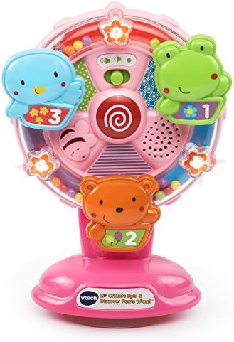 Product Description Spin the wheel of fun with the LilaTM Critters Spin and Discover Ferris Wheela by VTech! This unique toy attracts your babyaTMs attention with flashing stars, a friendly voice and happy music. It also includes a suction cup that holds the toy in place on high chairs and other smooth surfaces to make it easy to spin and strengthen motor skills. The Ferris wheel also includes five sing-along songs that encourage first words and cute animal buttons that teach numbers, colors and animals. Key Features: Ferris wheel spins and teaches numbers, colors and animals to help with language development,5 sing-along songs encourage first words,Flashing stars, friendly voice and happy music attract your baby's attention,Spinning the wheel develops gross motor skills,Convenient suction cup feature holds the toy in place on high chairs and other smooth surfaces for easy reach This product is designed with premium quality, ensuring durability and superior performance.