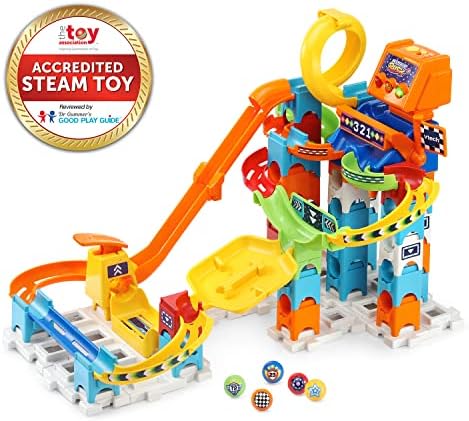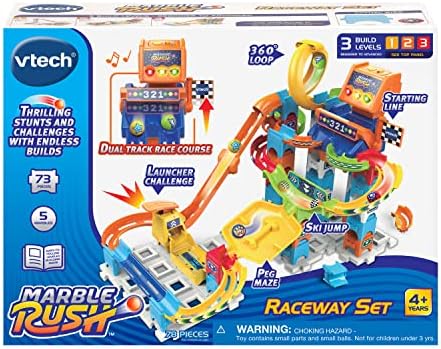 Product Description Ready, set, RACE marbles down ramps and through obstacles with the Marble Rusha Raceway Set. This 78-piece color-coded building set includes a starting gate that plays a musical light show, crazy 360Es loop, thrilling tracks, rattling peg maze and bases that all easily connect together. The easy-to-follow leveled guide includes three different builds from beginner to advanced, or create your own courses to explore STEAM (Science, Technology, Engineering, Art and Math) skills. Key Features: Includes five marbles and 73 building pieces featuring a musical starting gate, fast tracks, peg maze, launcher and more that easily connect,Color-coded blocks and an easy-to-follow guide help you construct three different builds from beginner to advanced or create your own to explore STEM skills,Compete with family and friends to build the best course and keep the marbles moving through thrilling stunts and challenges; Find more builds by visiting the VTech Kids website; create an extreme playset by combining Marble Rush sets (sold separately),Accredited STEAM (Science, Technology, Engineering, Art and Math) Toy by the Toy Association,Intended for ages 4+ years; requires 2 A batteries; batteries included for demo purposes only; new batteries recommended for regular use This product is designed with premium quality, ensuring durability and superior performance.